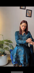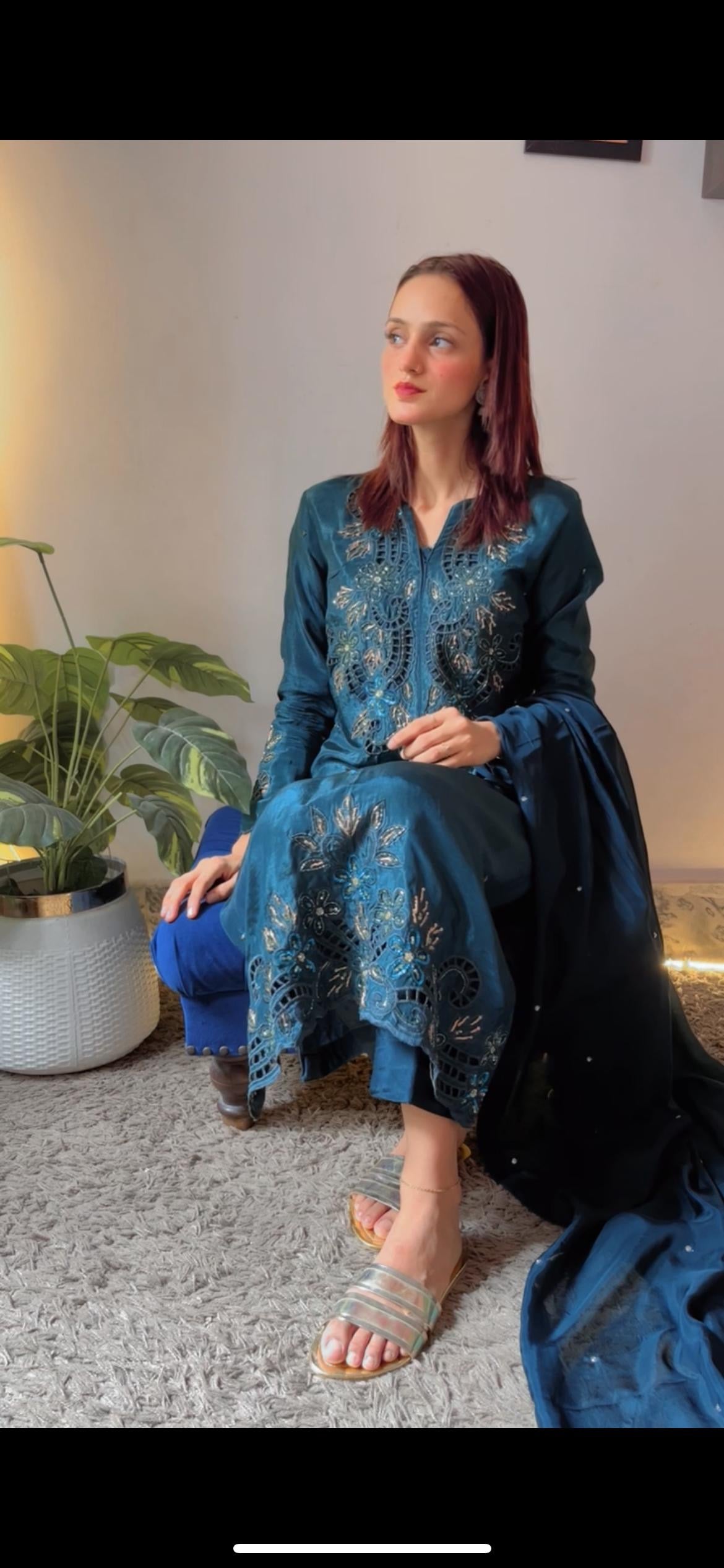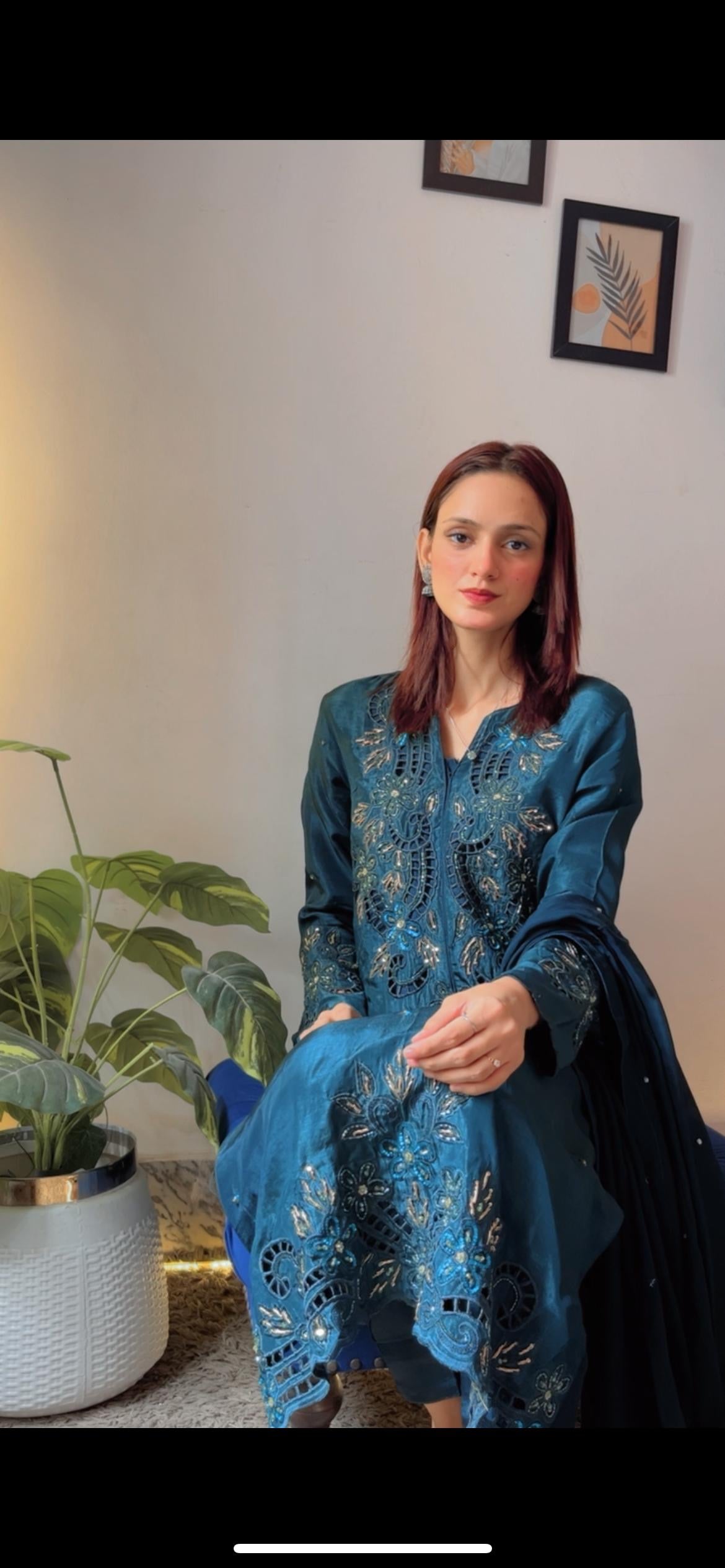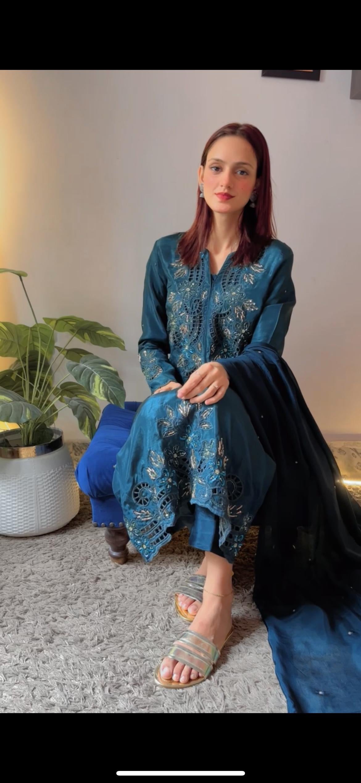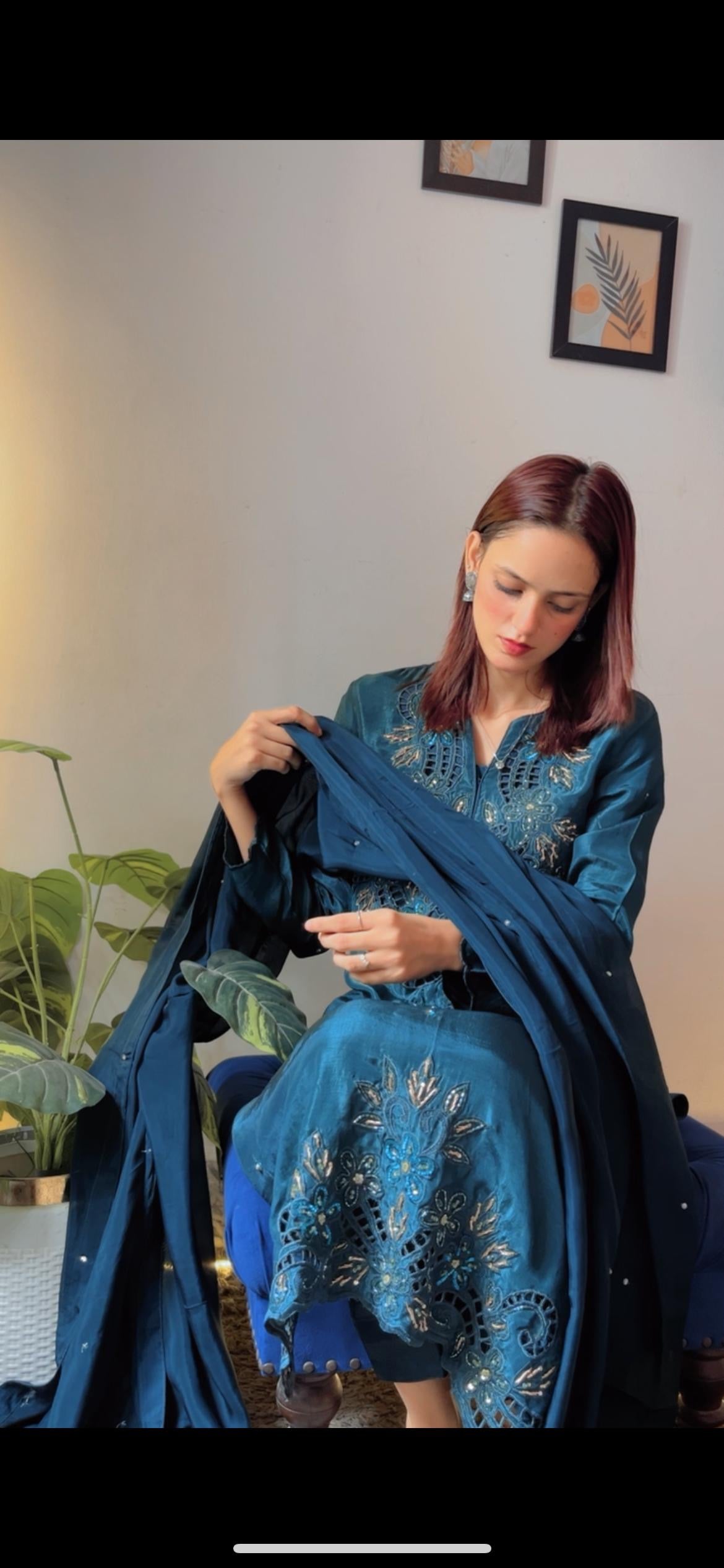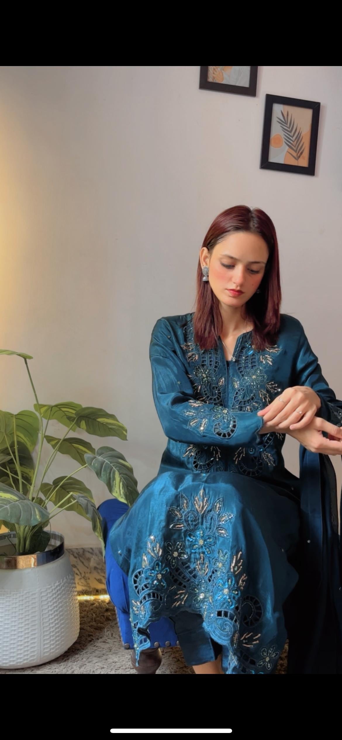 Effortlessly chic in outfit! This ready-to-wear Pure Tassle Silk dress features a long shirt stunning Cut work plus Hand work.
