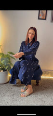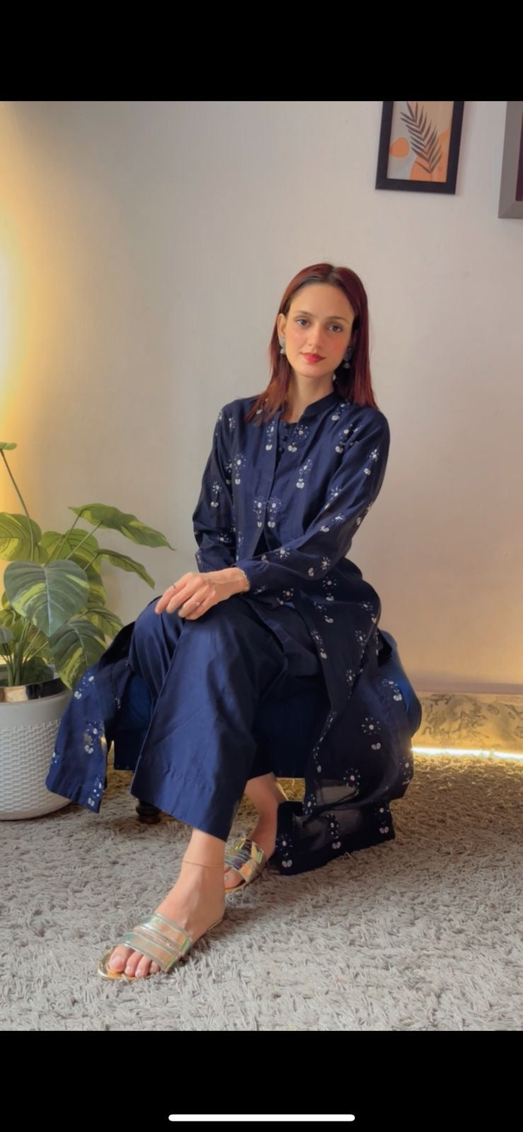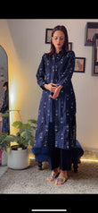 Step into effortless elegance with this beautifully crafted khadi silk ensemble, designed for the modern woman who values tradition with a touch of contemporary flair. The long, front-open shirt features intricate embroidery or handwork, adding depth, detail, and handcrafted charm to every look.
