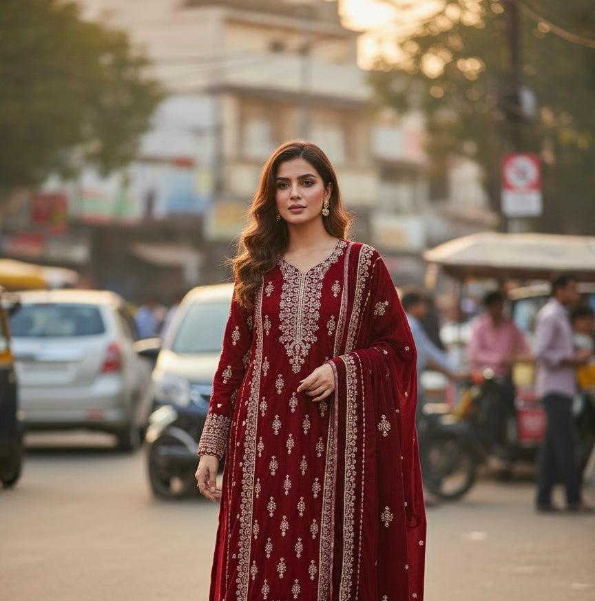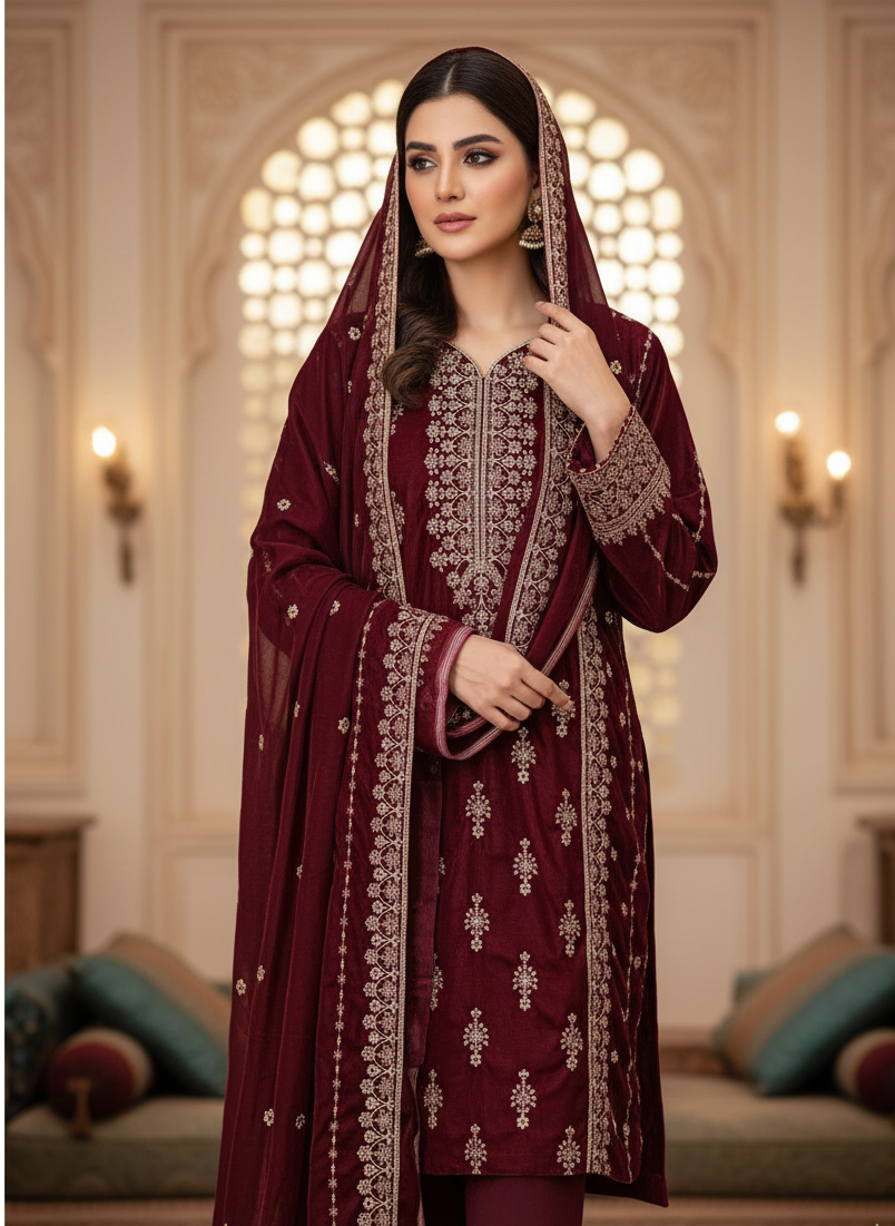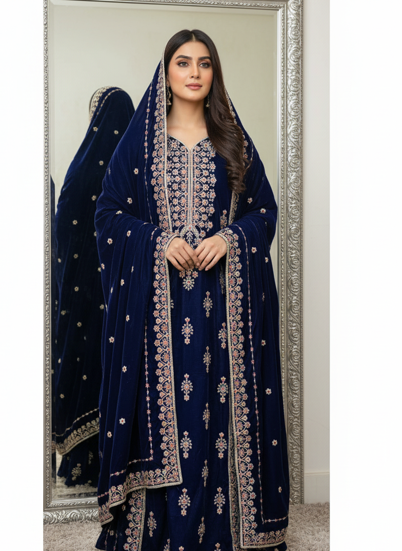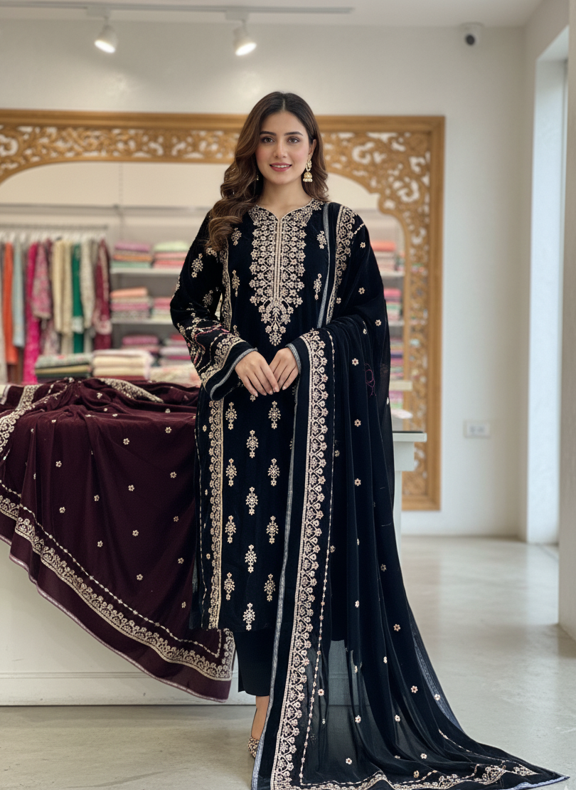 Indulge in timeless luxury with our Velvet Micro 9000gm Suit, paired with a matching Velvet Shawl that exudes grace and sophistication. Crafted from premium-quality micro velvet fabric, this outfit offers a rich texture, a soft touch, and an elegant drape that defines true royal style.