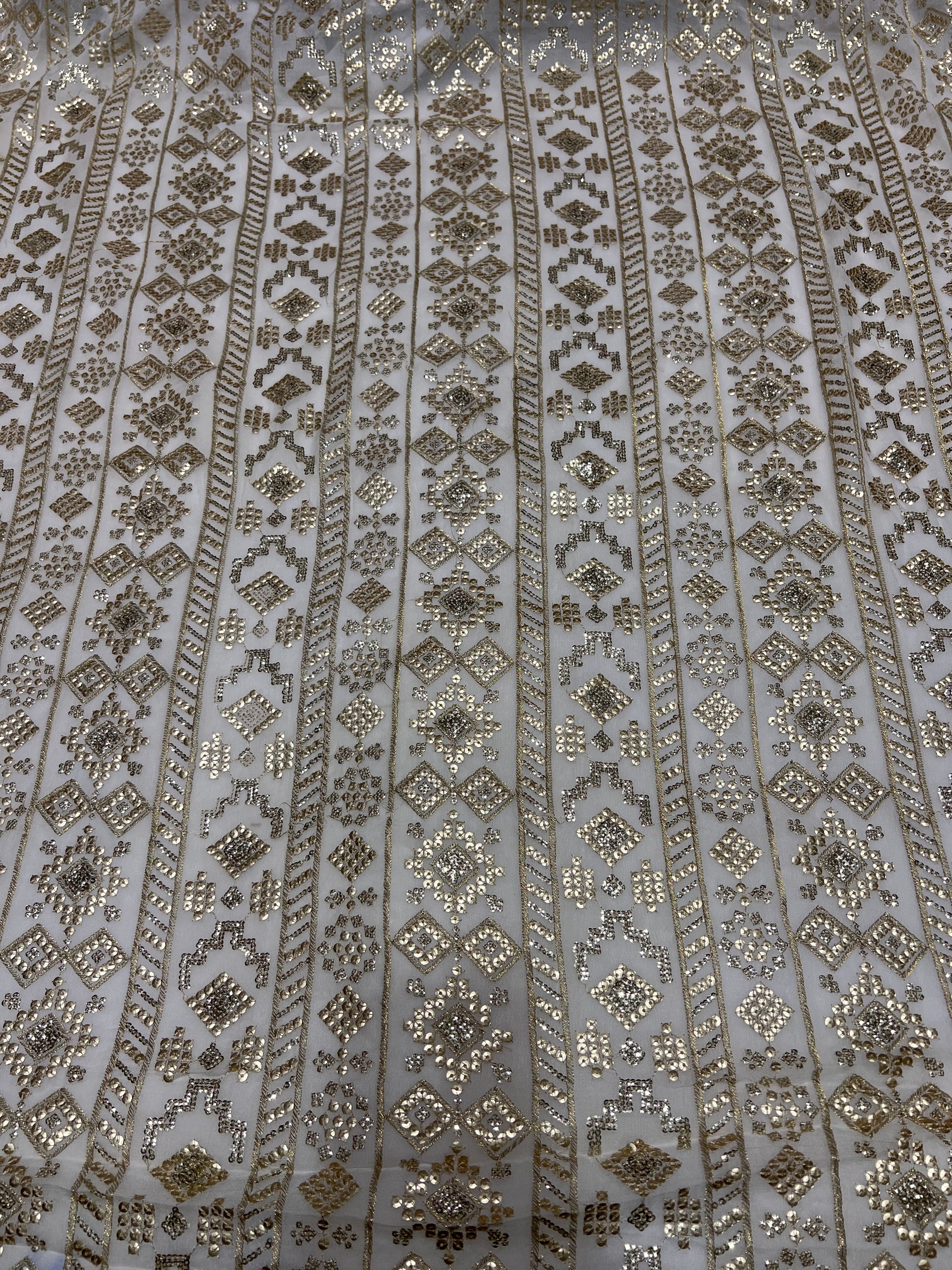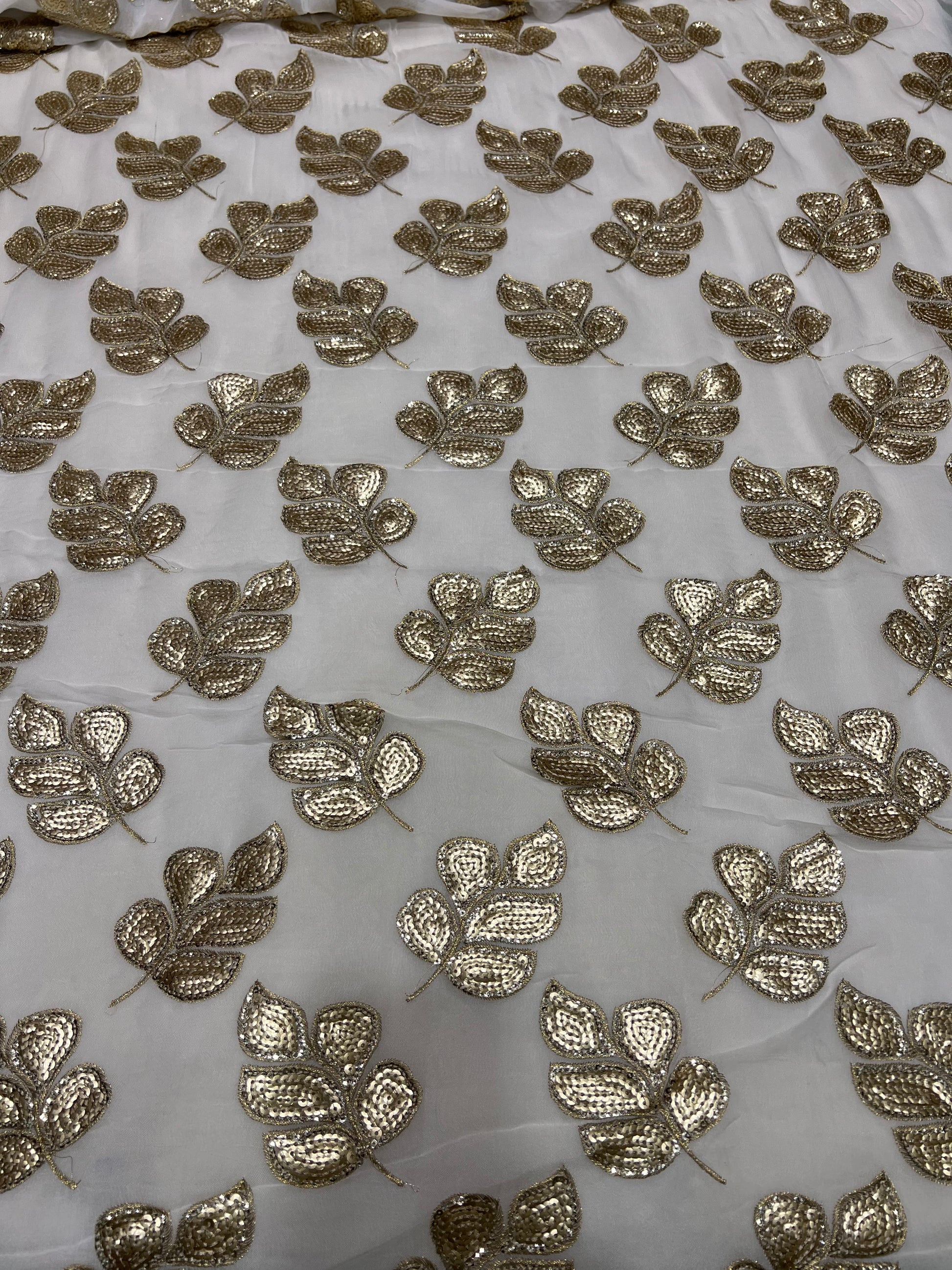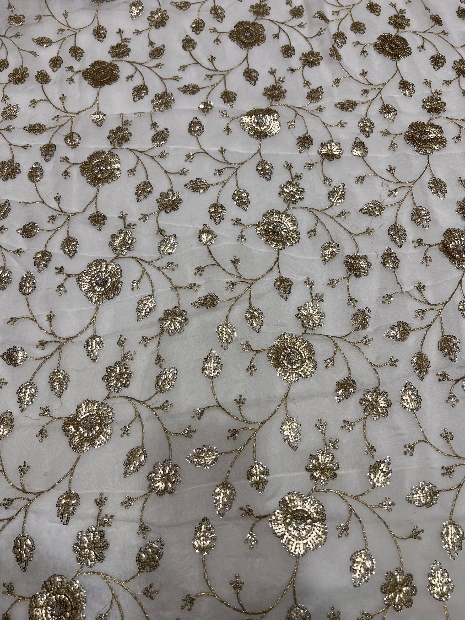 This fabric offers endless styling possibilities. Whether you’re designing for a wedding, festive occasion, or a couture piece, the dyeable white chiffon base gives you creative freedom, while the golden work adds a pre-embroidered touch of glamour.