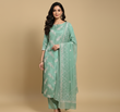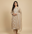 The set is complemented by a soft chiffon dupatta, adding a touch of delicate flow and completing the look with effortless beauty. Ideal for festive occasions, semi-formal gatherings, or daytime celebrations, this ensemble embodies purity, class, and modern traditional elegance.