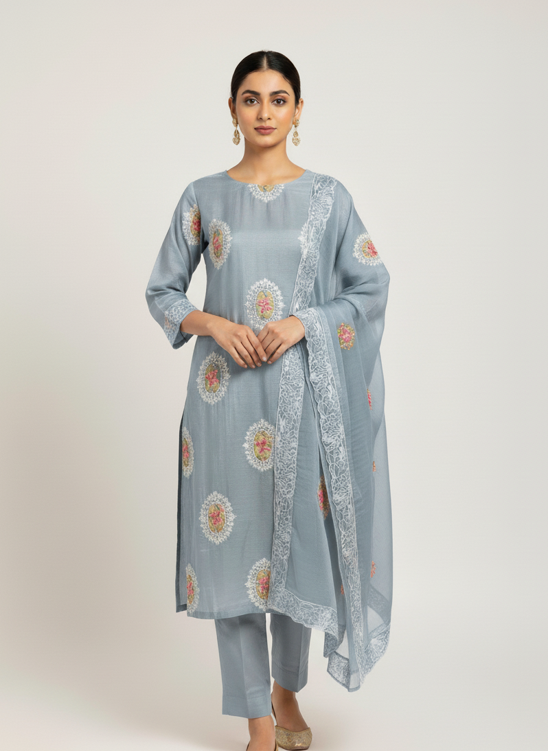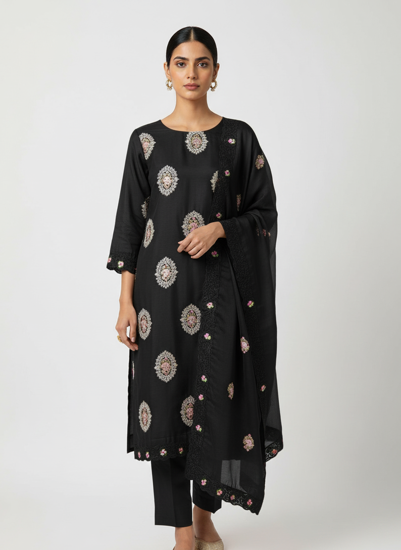 Paired with a lightweight chiffon dupatta, delicately detailed to complement the outfit, this set offers effortless elegance for festive occasions, weddings, and celebrations. The luxurious drape and fine craftsmanship make it perfect for women who appreciate refined traditional wear with a modern edge.