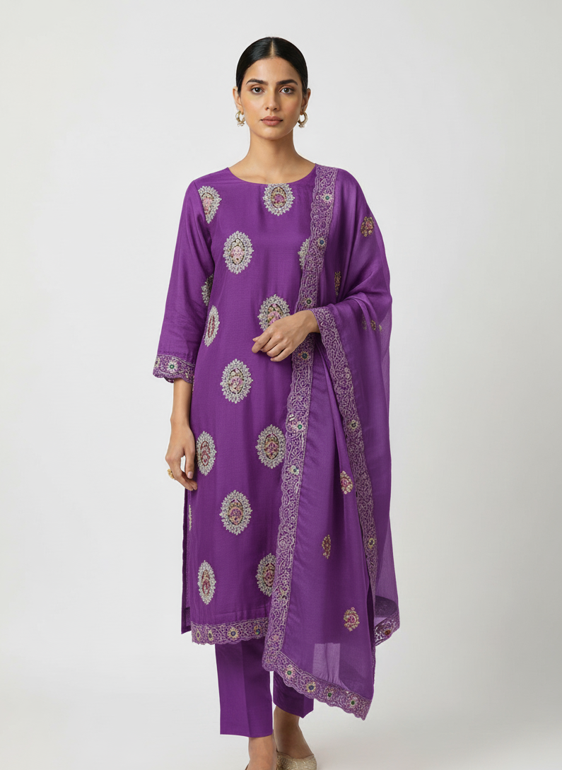 Elevate your ethnic wardrobe with our Raw Silk Shifli Work Suit, a timeless blend of sophistication and grace. Crafted from premium raw silk fabric, this ensemble features exquisite shifli embroidery that adds a touch of intricate charm and texture.
